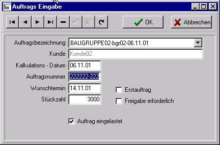 Neue Aufträge werden aus den eingegebenen Produkten (hier Baugruppen) zusammengestellt, mit Auftragsnummer,